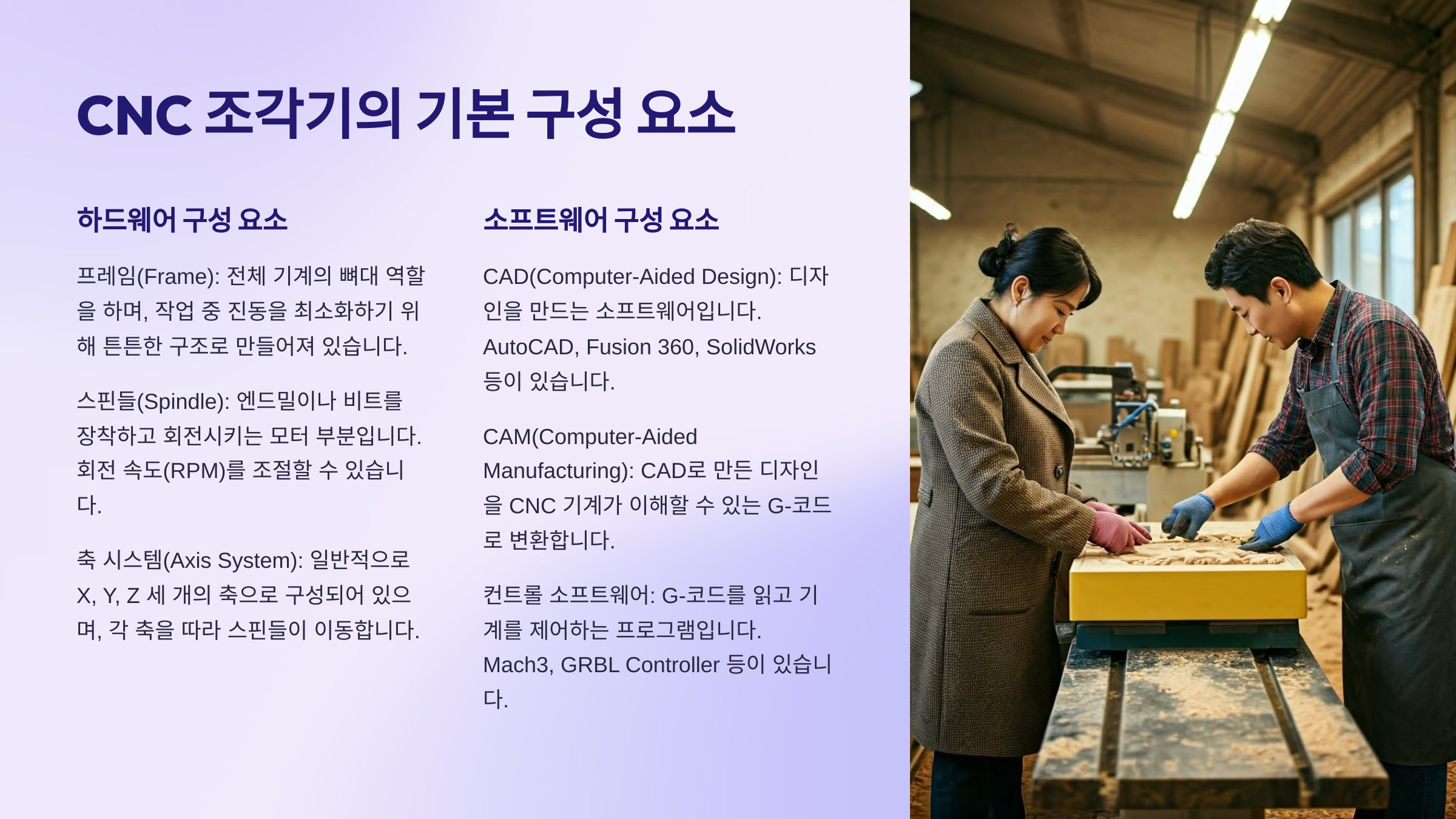CNC 조각기를 효과적으로 사용하기 위해서는 먼저 기본 구성 요소를 이해하는 것이 중요합니다. CNC 조각기는 크게 다음과 같은 부분으로 구성되어 있습니다: