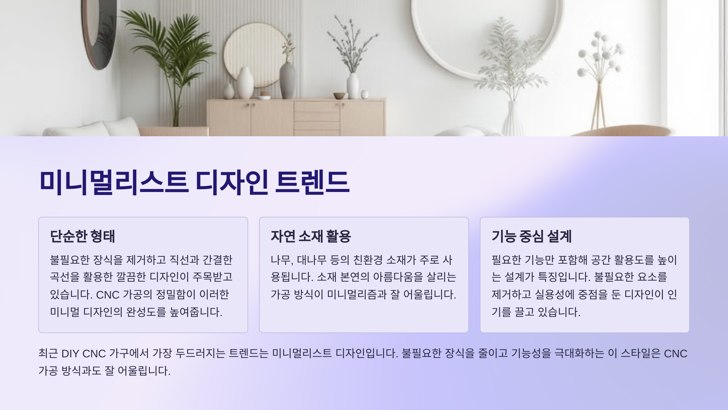 최근 DIY CNC 가구에서 가장 두드러지는 트렌드는 미니멀리스트 디자인입니다. 불필요한 장식을 줄이고 기능성을 극대화하는 이 스타일은 CNC 가공 방식과도 잘 어울립니다.