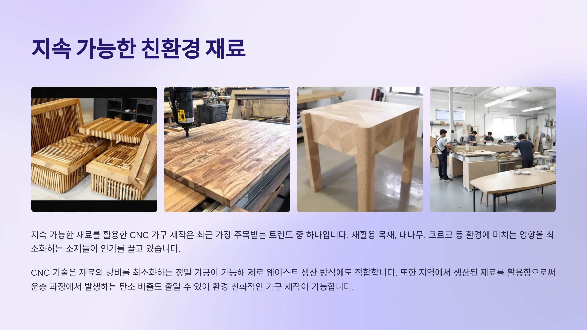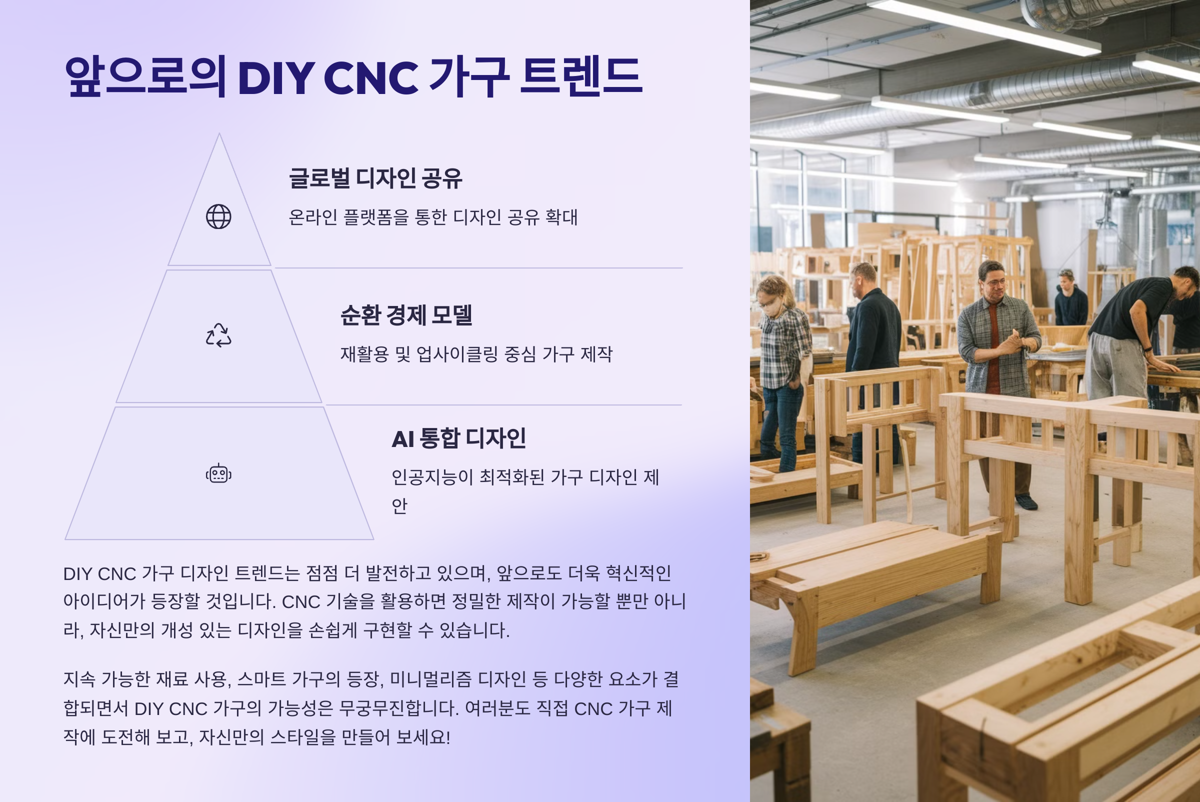 지속 가능한 재료 사용, 스마트 가구의 등장, 미니멀리즘 디자인 등 다양한 요소가 결합되면서 DIY CNC 가구의 가능성은 무궁무진합니다. 여러분도 직접 CNC 가구 제작에 도전해 보고, 자신만의 스타일을 만들어 보세요!