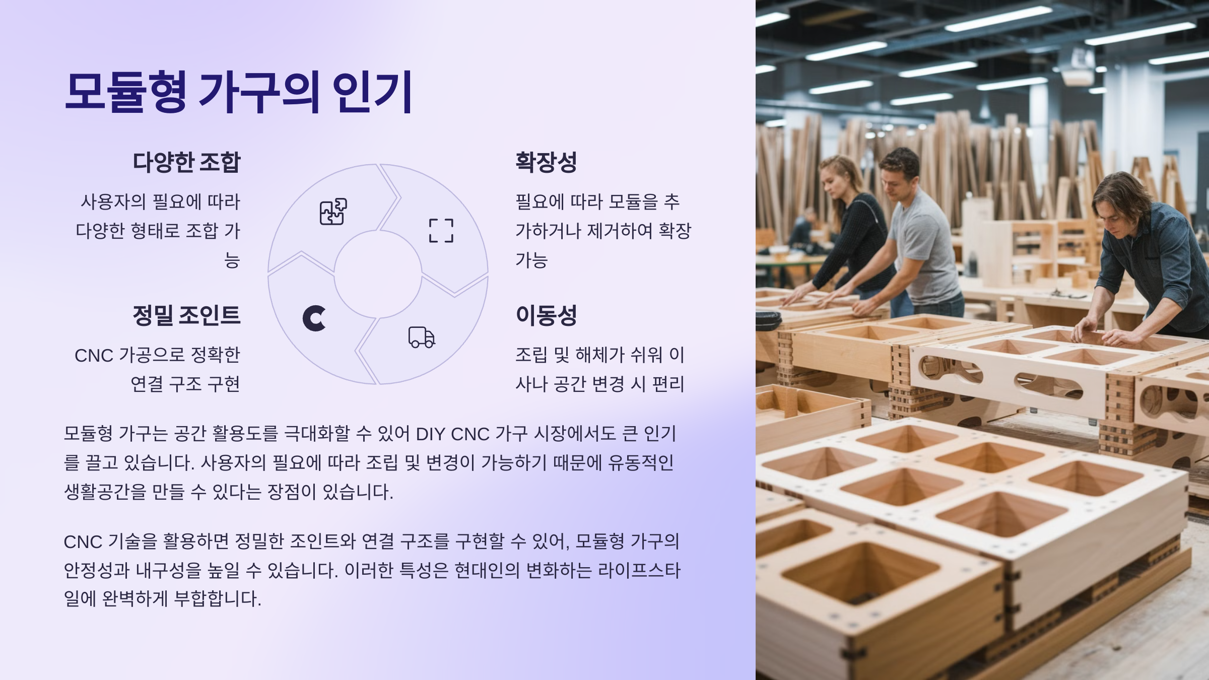 모듈형 가구는 공간 활용도를 극대화할 수 있어 DIY CNC 가구 시장에서도 큰 인기를 끌고 있습니다. 사용자의 필요에 따라 조립 및 변경이 가능하기 때문에 유동적인 생활공간을 만들 수 있다는 장점이 있습니다.