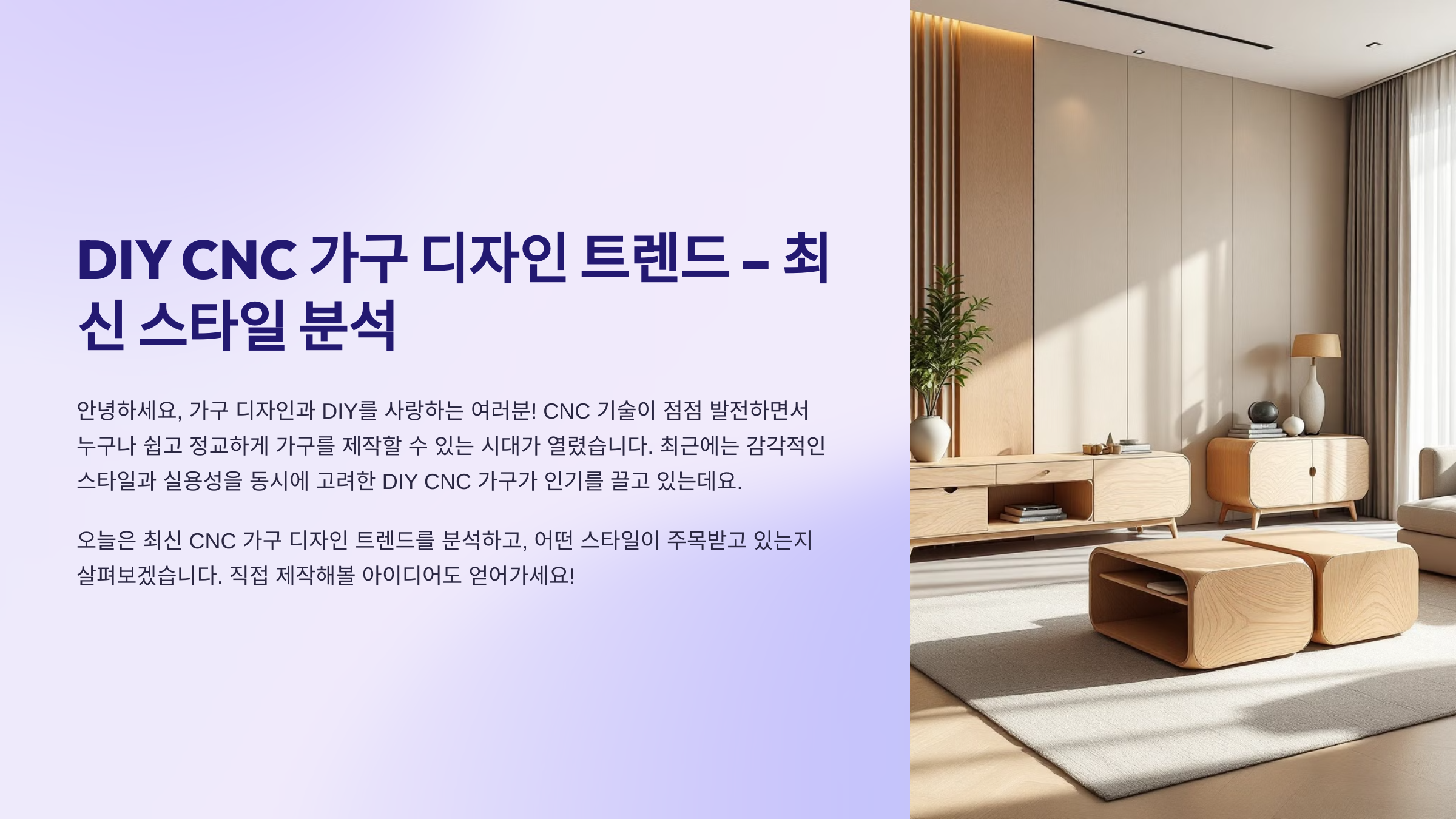 안녕하세요, 가구 디자인과 DIY를 사랑하는 여러분! CNC 기술이 점점 발전하면서 누구나 쉽고 정교하게 가구를 제작할 수 있는 시대가 열렸습니다. 최근에는 감각적인 스타일과 실용성을 동시에 고려한 DIY CNC 가구가 인기를 끌고 있는데요. 오늘은 최신 CNC 가구 디자인 트렌드를 분석하고, 어떤 스타일이 주목받고 있는지 살펴보겠습니다. 직접 제작해볼 아이디어도 얻어가세요!