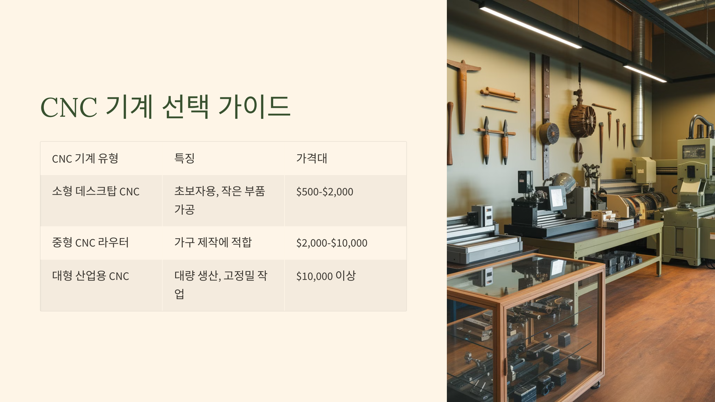 | 대형 산업용 CNC | 대량 생산 및 고정밀 작업 가능 | $10,000 이상 |