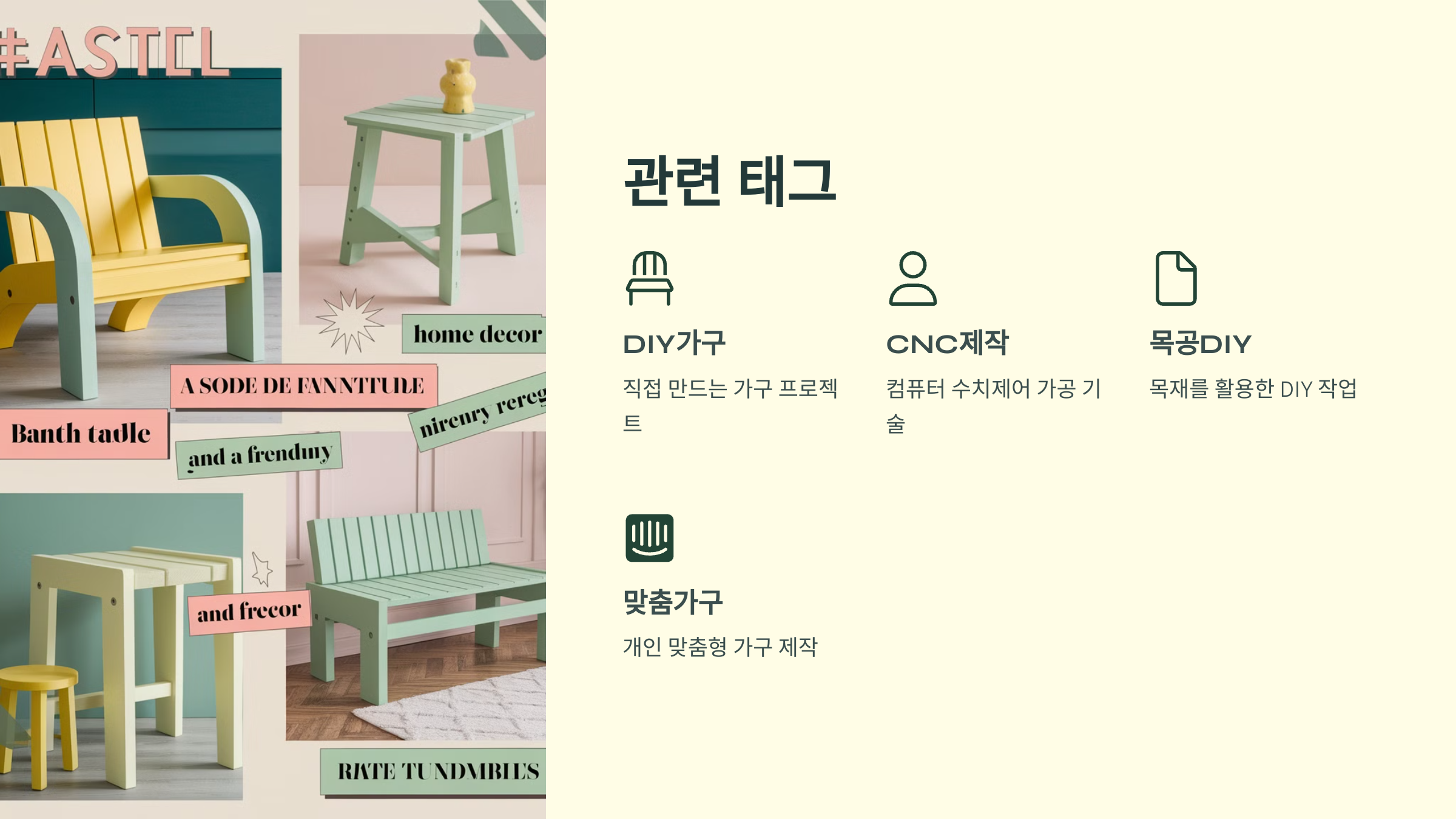 가구 제작에 사용되는 주요 소재는 다음과 같습니다.