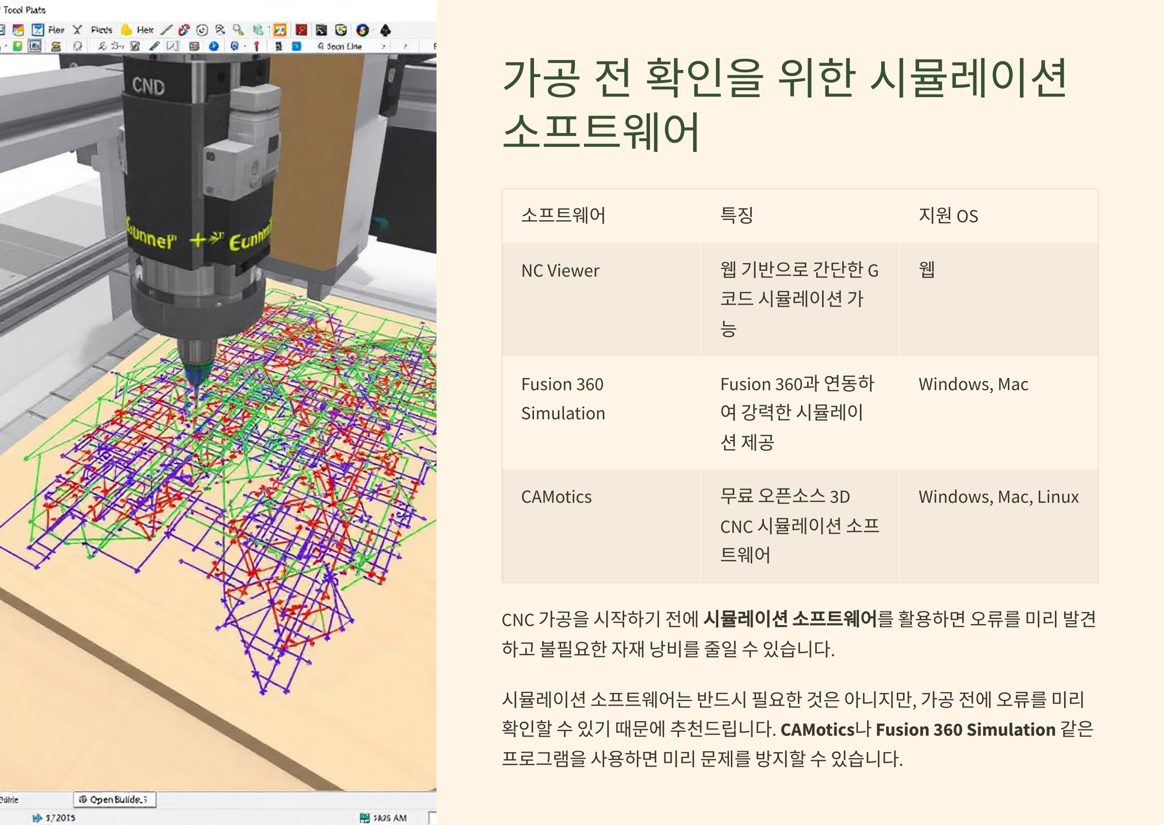반드시 필요한 것은 아니지만, 가공 전에 오류를 미리 확인할 수 있기 때문에 추천드립니다. **CAMotics**나 **Fusion 360 Simulation** 같은 프로그램을 사용하면 미리 문제를 방지할 수 있습니다.