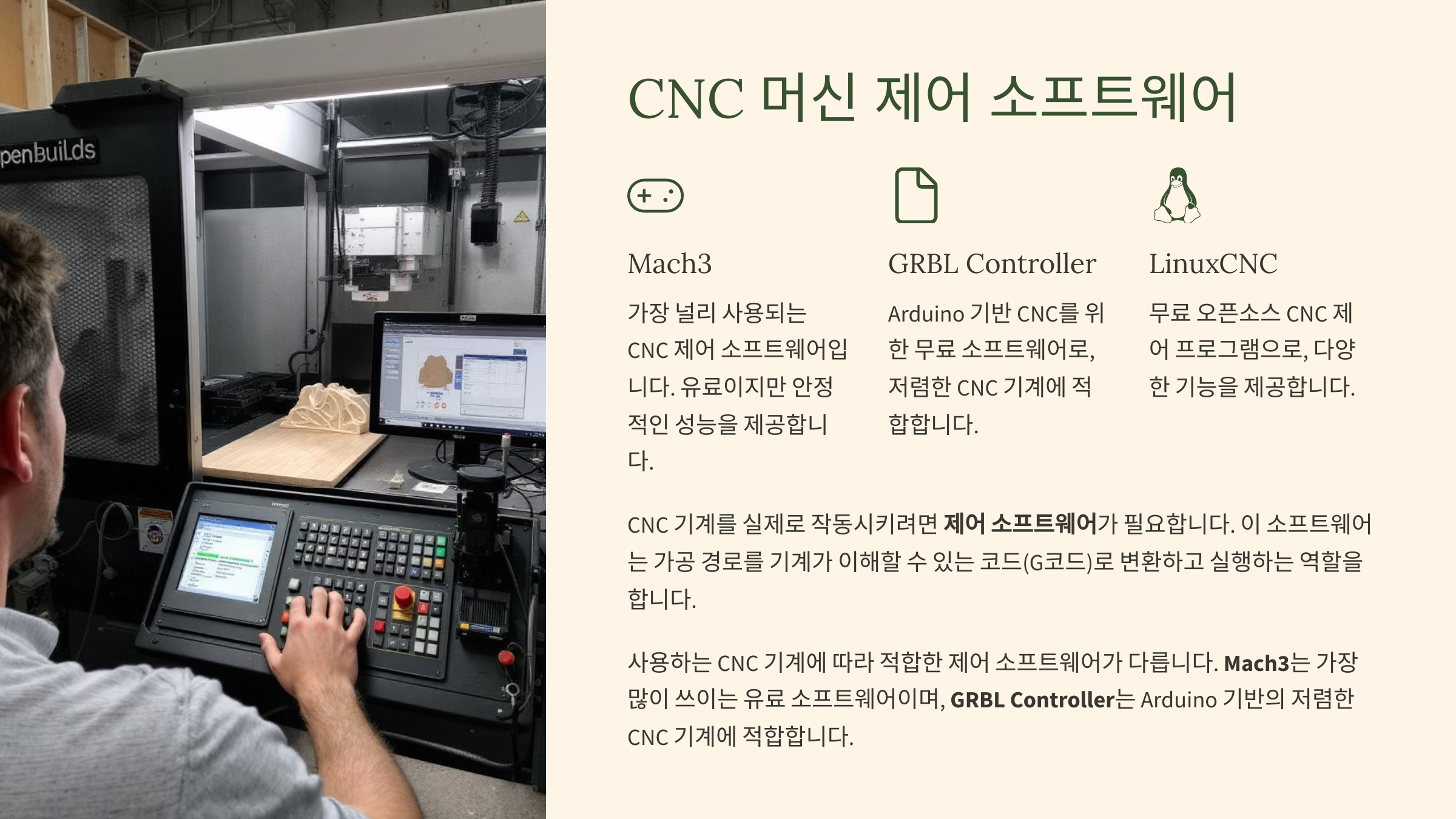 CNC 기계를 실제로 작동시키려면 **제어 소프트웨어**가 필요합니다. 이 소프트웨어는 가공 경로를 기계가 이해할 수 있는 코드(G코드)로 변환하고 실행하는 역할을 합니다.