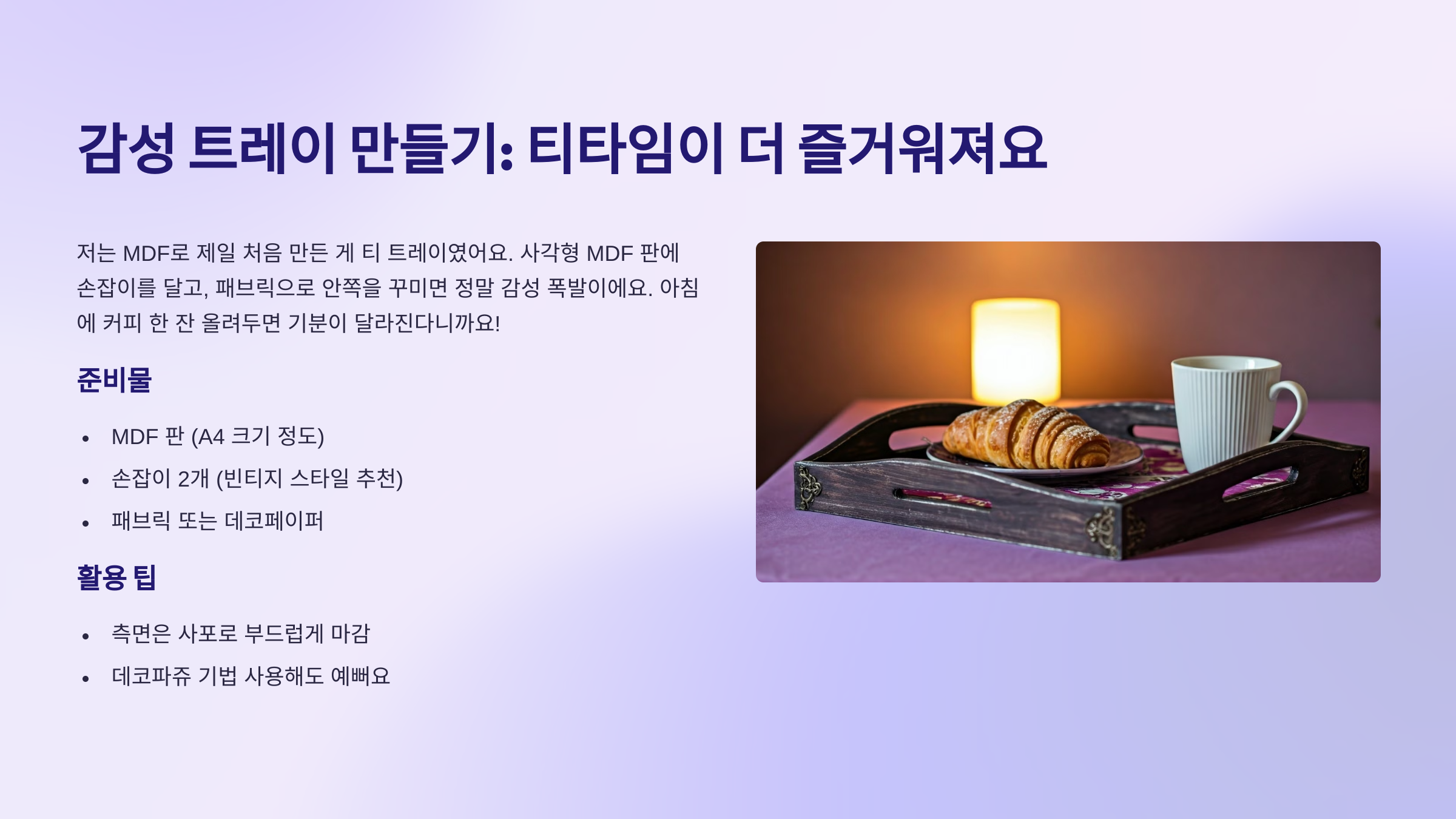 저는 MDF로 제일 처음 만든 게 티 트레이였어요. 사각형 MDF 판에 손잡이를 달고, 패브릭으로 안쪽을 꾸미면 정말 감성 폭발이에요. 아침에 커피 한 잔 올려두면 기분이 달라진다니까요! 아래는 필요한 재료와 제작 팁을 정리해봤어요.