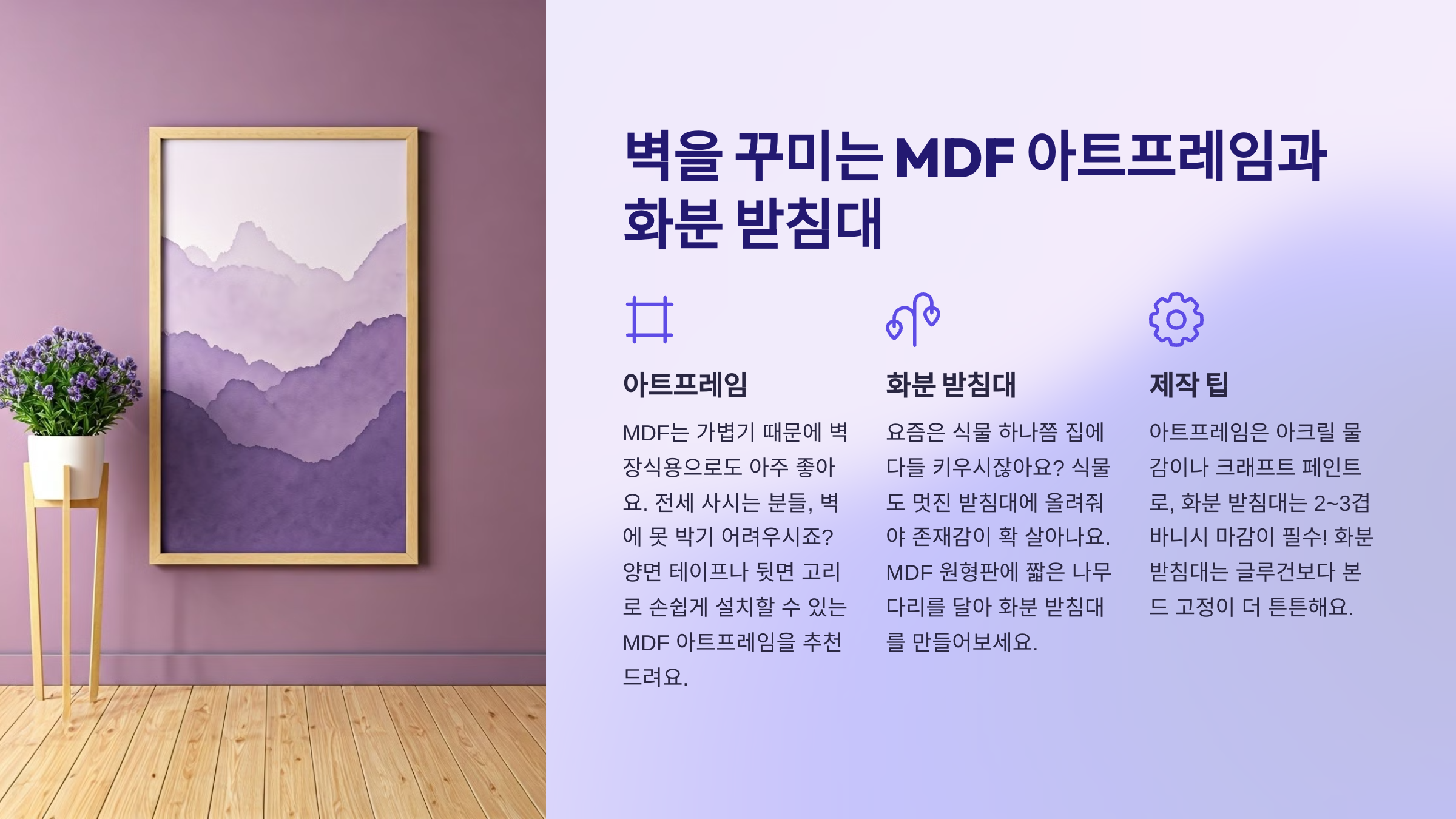 MDF는 가볍기 때문에 벽 장식용으로도 아주 좋아요. 저처럼 전세 사시는 분들, 벽에 못 박기 어려우시죠? 이럴 땐 양면 테이프나 뒷면 고리로 손쉽게 설치할 수 있는 MDF 아트프레임을 추천드려요. 만드는 과정도 단순하고, 내가 좋아하는 문구나 이미지를 입히면 세상에 하나뿐인 벽 장식이 된답니다.
