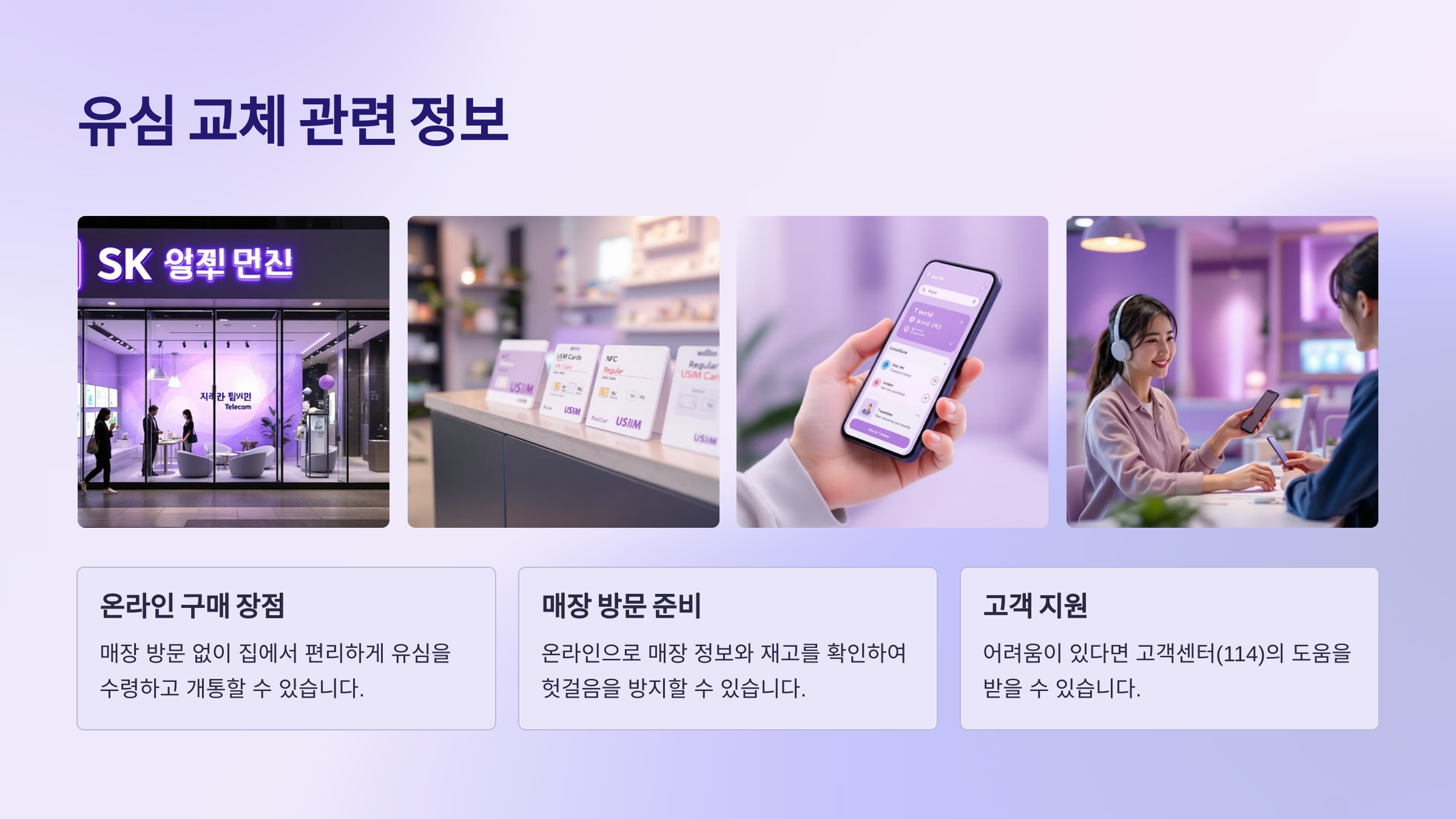 갑자기 휴대폰 유심(USIM) 카드가 말썽을 부리거나, 안타깝게 분실했을 때 가장 먼저 드는 생각은 '이제 어떻게 하지?'일 것입니다. 통화도, 데이터 사용도 불가능해지는 상황은 상상만으로도 답답합니다. 하지만 너무 걱정하지 마세요. SK텔레콤은 전국 곳곳에 고객들이 쉽고 빠르게 유심 문제를 해결할 수 있는 공식 매장을 운영하고 있습니다. 복잡한 절차 없이 가까운 매장을 방문하면, 대부분의 경우 신속하게 새 유심으로 교체하고 끊겼던 통신 서비스를 다시 이용할 수 있습니다.