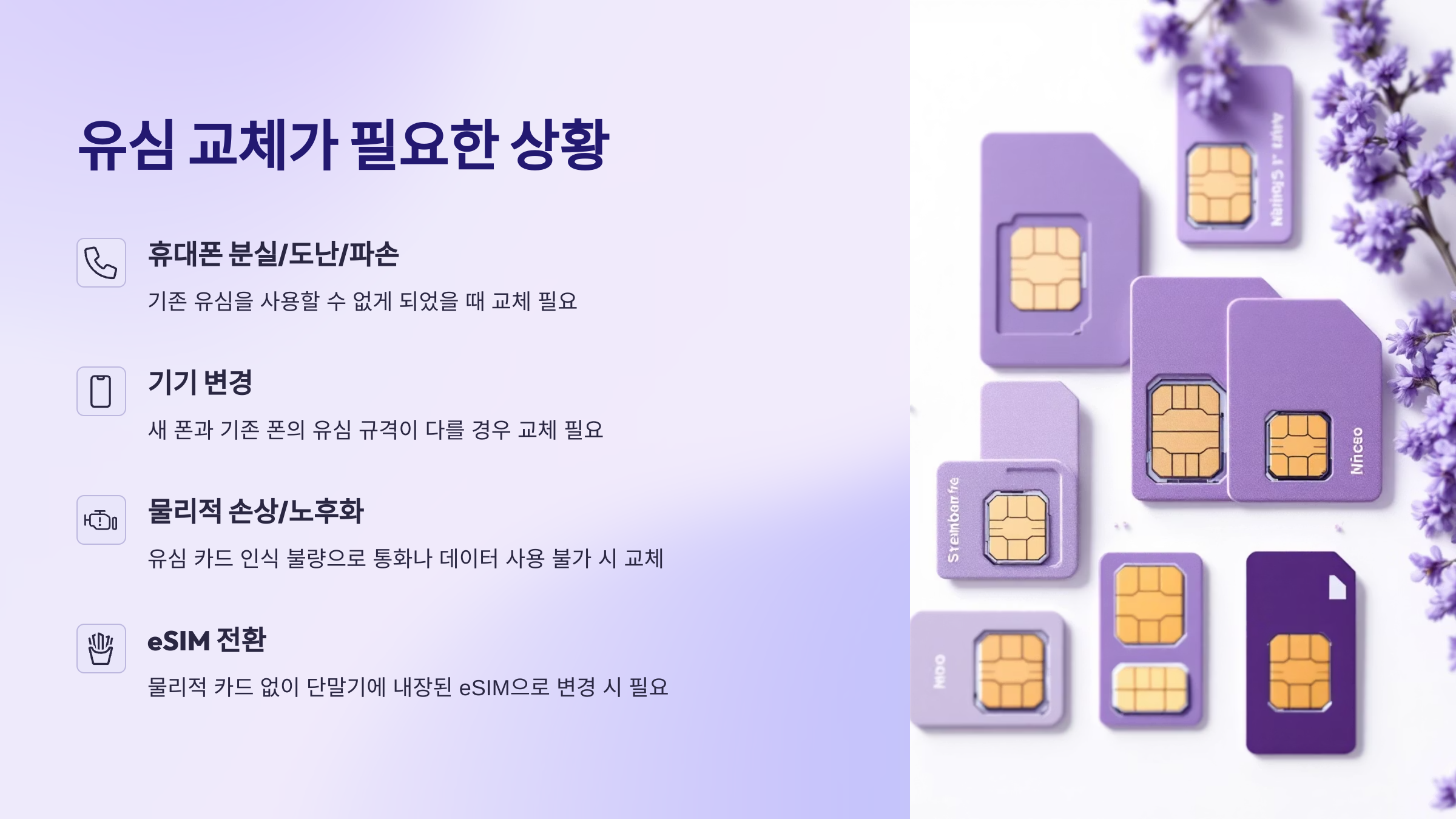 SK텔레콤 유심을 교체해야 하는 상황은 다양하게 발생합니다. 가장 대표적인 경우는 사용하던 휴대폰의 분실이나 도난, 혹은 심각한 파손으로 기존 유심을 사용할 수 없게 되었을 때입니다. 이 경우, 즉시 유심을 교체해야 정상적인 통신 서비스 이용이 가능합니다. 또한, 새로운 스마트폰으로 기기를 변경했는데, 기존 폰과 새 폰의 유심 카드 규격(일반/마이크로/나노)이 달라 호환되지 않는 경우에도 새 규격에 맞는 유심으로 교체해야 합니다. 때로는 유심 카드 자체의 물리적인 손상이나 노후화로 인한 인식 불량 문제가 발생하기도 합니다. 이럴 경우, 휴대폰이 유심을 제대로 읽지 못해 통화나 데이터 사용이 불가능해지므로 교체가 필요합니다. 최근에는 물리적인 카드 없이 단말기에 내장된 eSIM(임베디드 심)으로 변경하거나, 반대로 eSIM에서 물리 유심으로 전환하는 경우에도 새로운 유심 발급 또는 교체 절차가 필요할 수 있습니다. 교통카드 기능 등이 포함된 NFC 유심으로 변경하고자 할 때도 교체 대상입니다.