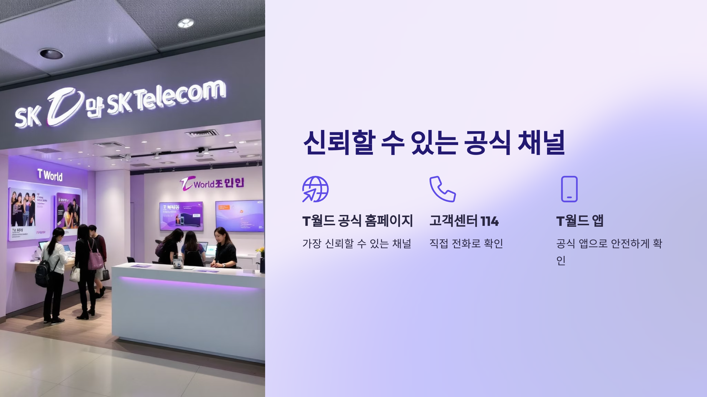 • 진짜 SKT 안내 가능성 높음: SKT 공식 발신 번호(예: 114, 회사 대표번호 등)로 발송되거나, 발신자 이름이 'SK telecom', 'T월드' 등으로 명확히 표시되는 경우.