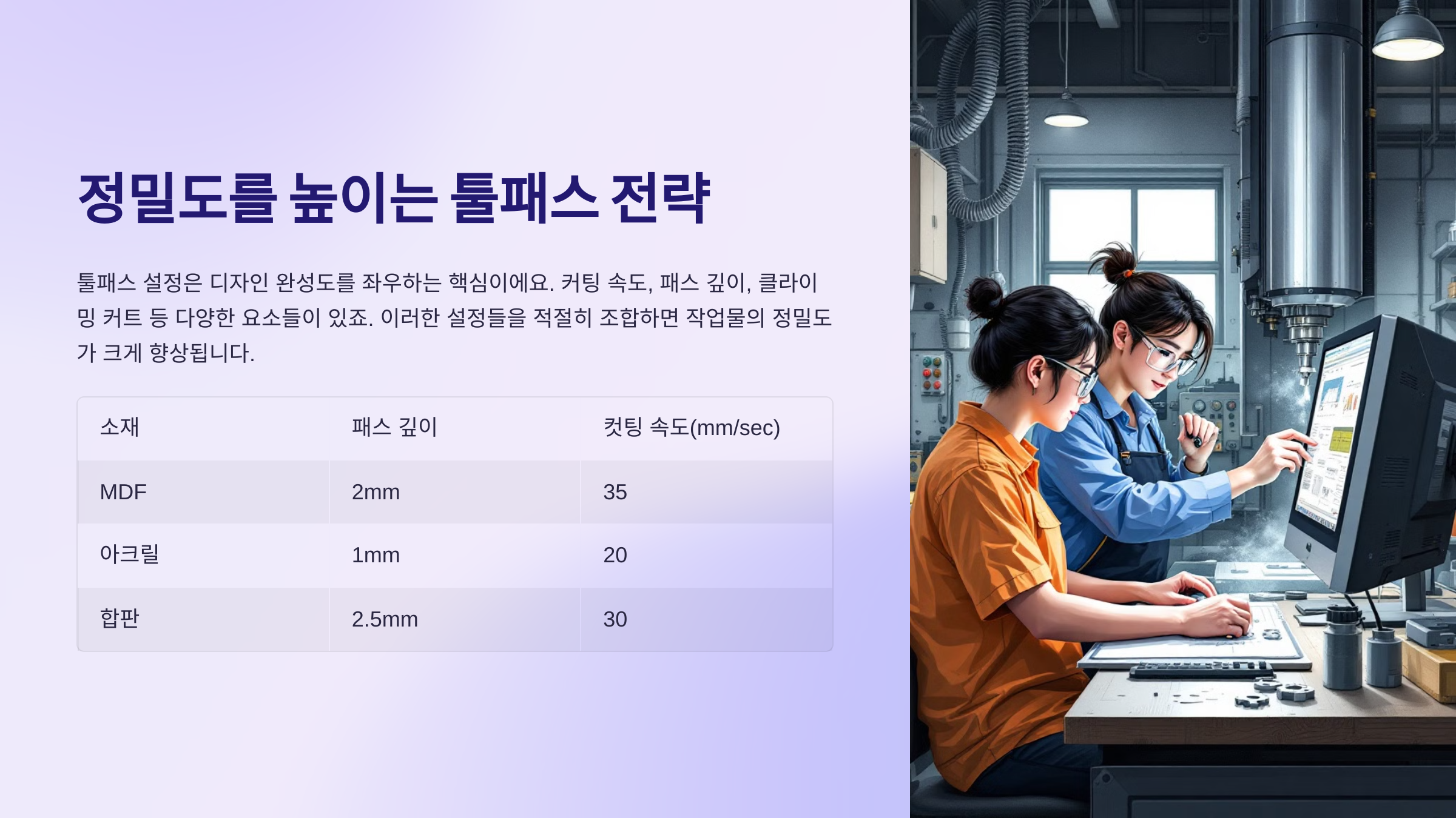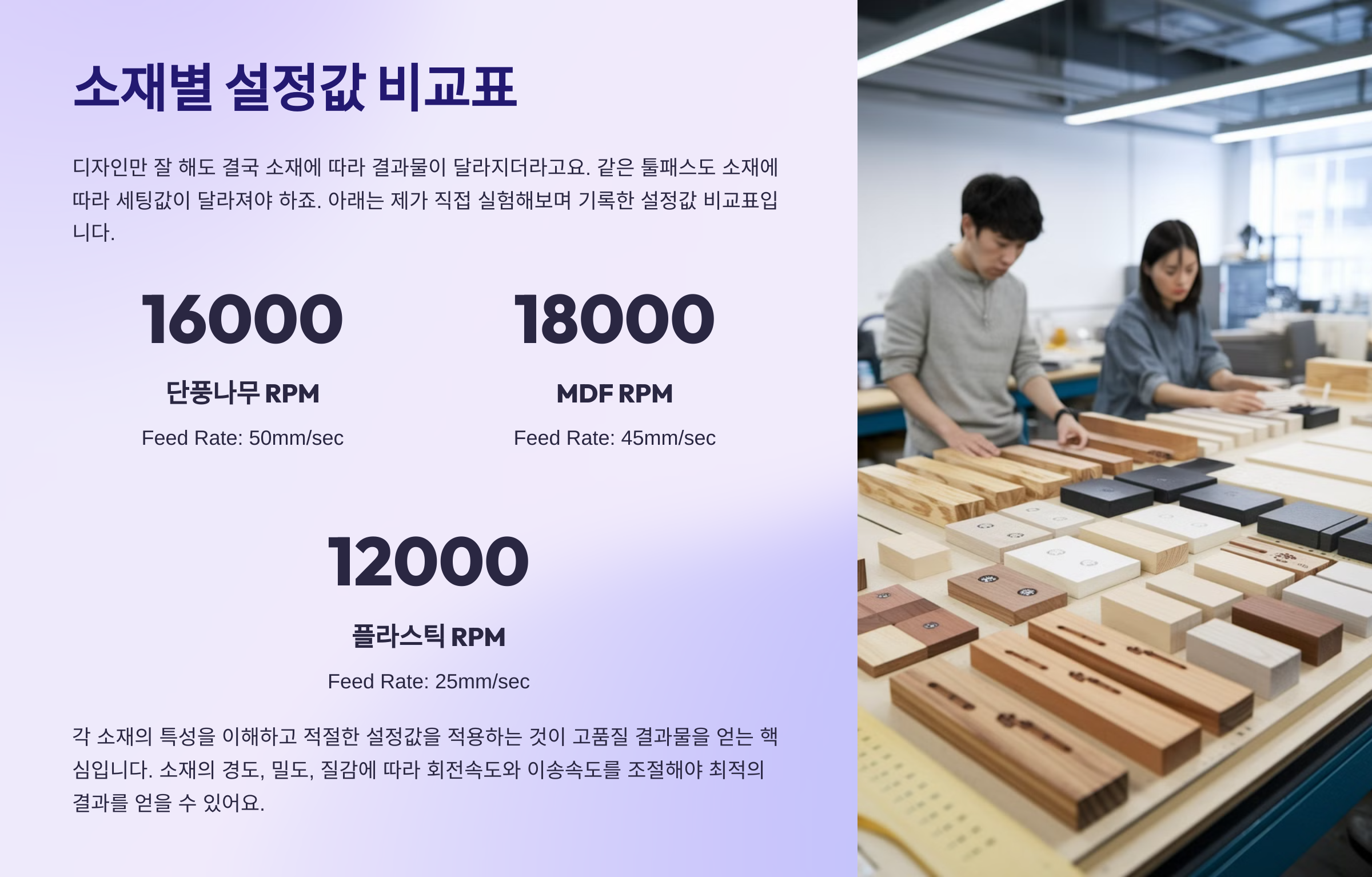 디자인만 잘 해도 결국 소재에 따라 결과물이 달라지더라고요. 같은 툴패스도 소재에 따라 세팅값이 달라져야 하죠. 아래는 제가 직접 실험해보며 기록한 설정값 비교표입니다.