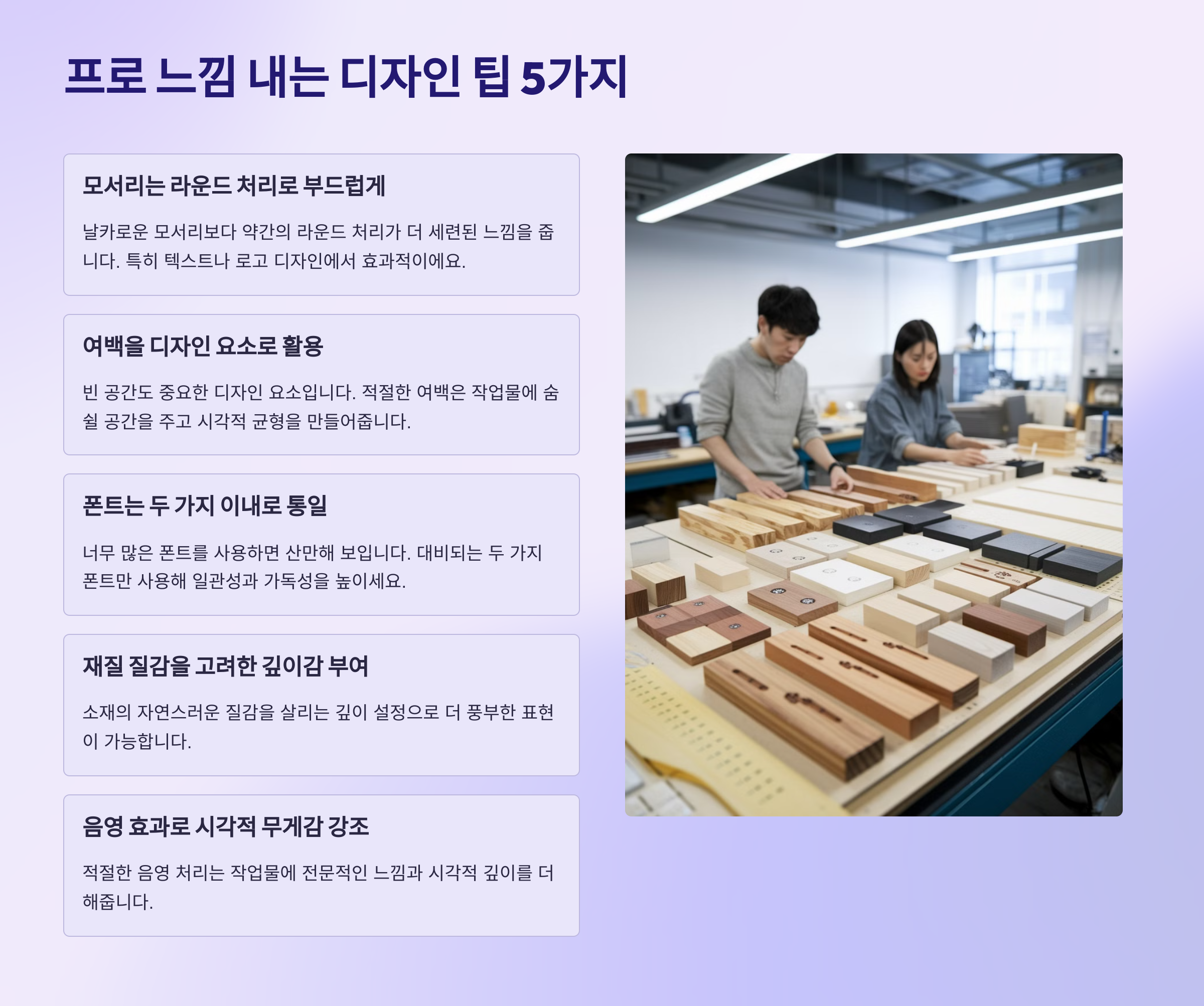 디자인이 뭔가 허전하다면, 아래 다섯 가지 팁을 적용해보세요. 진짜 '작업물 느낌'이 확 살아나요.